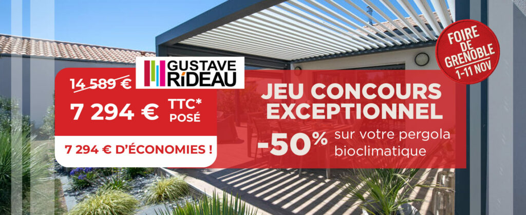 Le lot mis en jeu est une remise exceptionnelle de 50 % sur une pergola bioclimatique Gustave Rideau, incluant 4 bandeaux LED.
