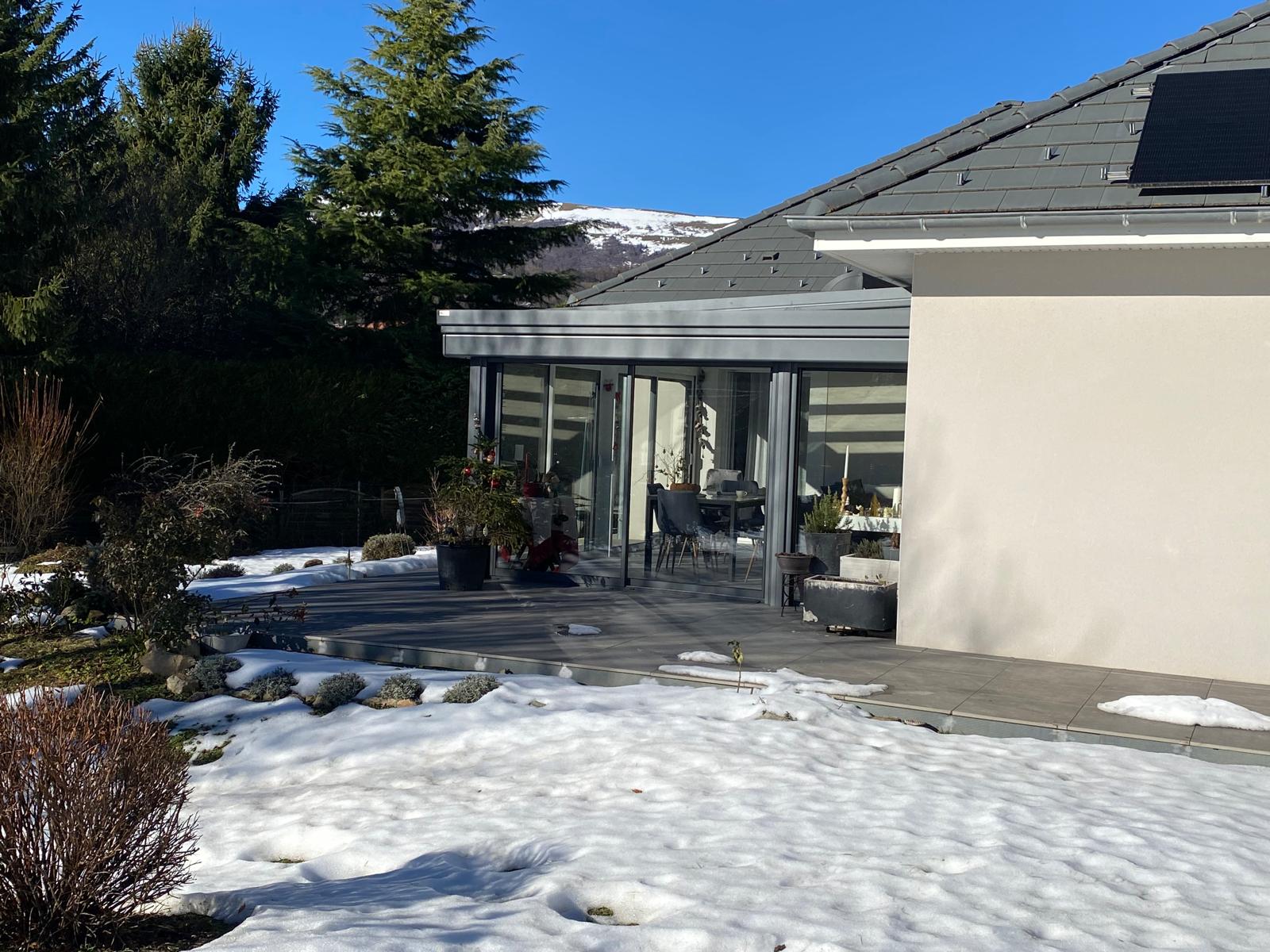 Nos clients, installés à Saint-Théoffrey, souhaitaient agrandir leur maison tout en profitant pleinement de la vue imprenable sur les montagnes. Nous leur avons proposé une véranda au style moderne signée GUSTAVE RIDEAU, avec une structure en aluminium anthracite, de grandes baies vitrées coulissantes et une toiture plate élégante en partie vitrée.